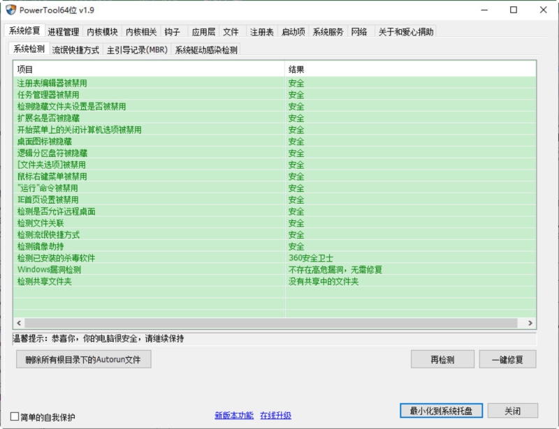 随着时间的推移与技术的不断进步,PowerTool 实现了质的飞跃,如今已成功发展成为一个全面且综合性强的系统维护工具。它完美支持 Windows 7 和 Windows 8 系统,为广大使用这两个系统的用户提供了可靠的安全保障。在功能方面,PowerTool 拥有众多实用且强大的功能模块。系统修复模块能够智能检测系统中存在的各类问题,如系统文件损坏、系统设置异常等,并自动进行修复,让系统恢复到正常稳定的运行状态。进程管理功能在原有基础上进一步优化,不仅能更精准地识别恶意进程,还能深入分析进程之间的关联,帮助用户更好地理解系统运行情况。内核模块专注于对系统内核的监控与维护,确保内核的安全性与稳定性,防止恶意程序对内核进行篡改。内核相关功能则提供了一系列与内核相关的高级操作,满足专业用户的需求。