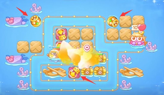 3、在下方喷火瓶旁边建造一排章鱼清掉中间的障碍物;