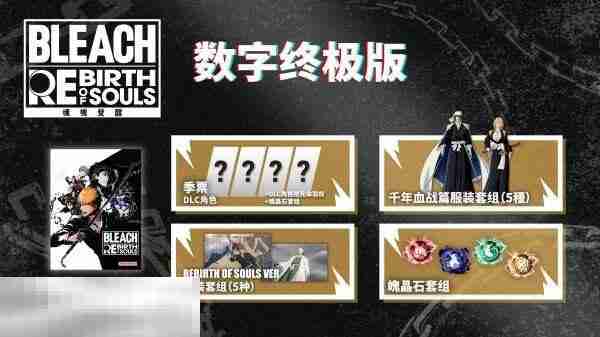 游戏本体季票季票特典:DLC角色抢先体验权(7天)魄晶石套装1(攻势魄晶石【浅伤】、防势魄石【忍耐】)数字豪华版特典:魄晶石套装2(灵压魄晶石【简略】、特殊魄晶石【追风】)千年血战篇服装套组Rebirth of Souls Ver服装套组数字终极版特典:魄晶石套装3(攻势魄晶石【无缺】、防势魄晶石【万全】)