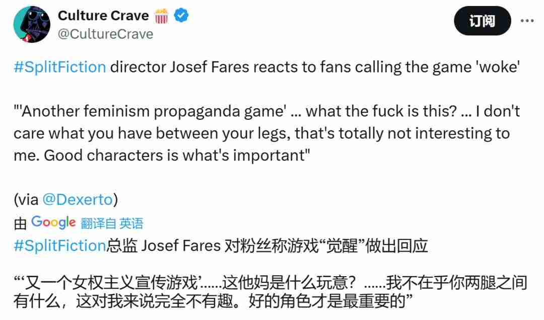 针对游戏被批评为“觉醒游戏”的言论,创意总监Josef Fares回应道:“‘又一个女权主义宣传游戏’……这是什么鬼?……我不在乎你两腿之间是什么,那对我来说完全不重要。关键在于角色塑造是否优秀。”