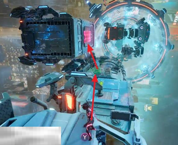 齿轮机关: 通过跳跃移动的齿轮到达尽头,攻击大门进入驾驶室。紫人移动至左前方板块,攻击红色方框所示的机关。